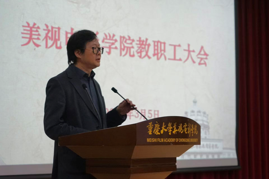 美视电影学院新学期全体教职工会议于2026年3月5日在学院阶梯教室召开,会议由学院院长范蓓主持。