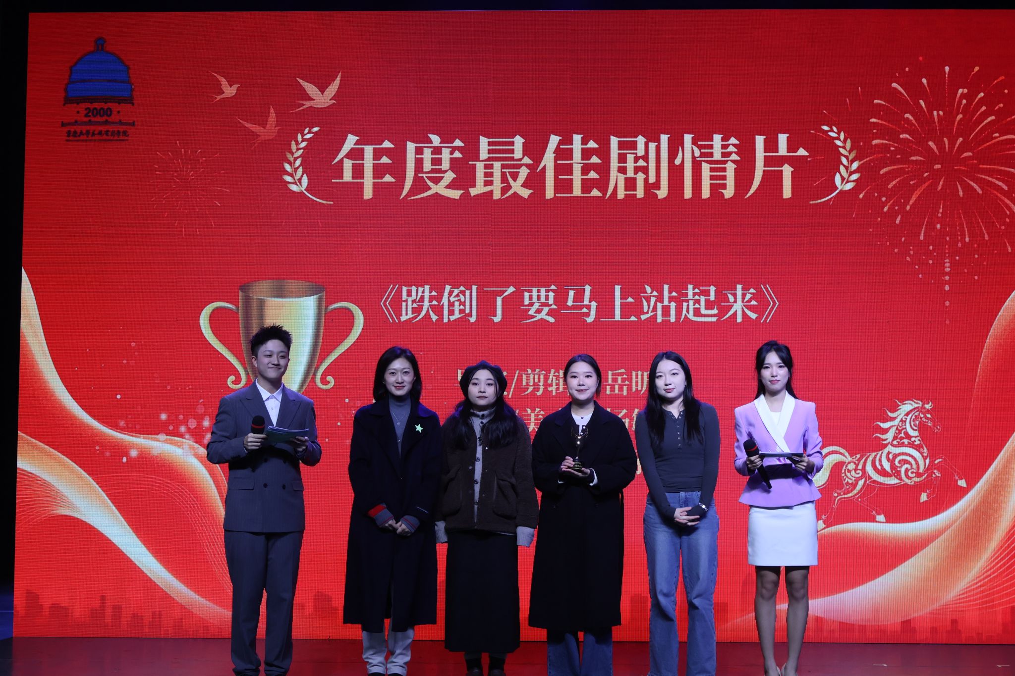 美视电影学院党委副书记、纪委书记赵华和美视电影学院副院长马欣教授分别为《跌倒了要马上站起来》的主创团队——岳昕彤、杨敏珑和释雅雯颁发“年度最佳剧情片”和“大众评审团大奖”,并送上祝福。该片在羊毛毡质感与温情内核中产生奇妙共振,用童真动画包裹面对生命的韧性态度,引发观众广泛共鸣。