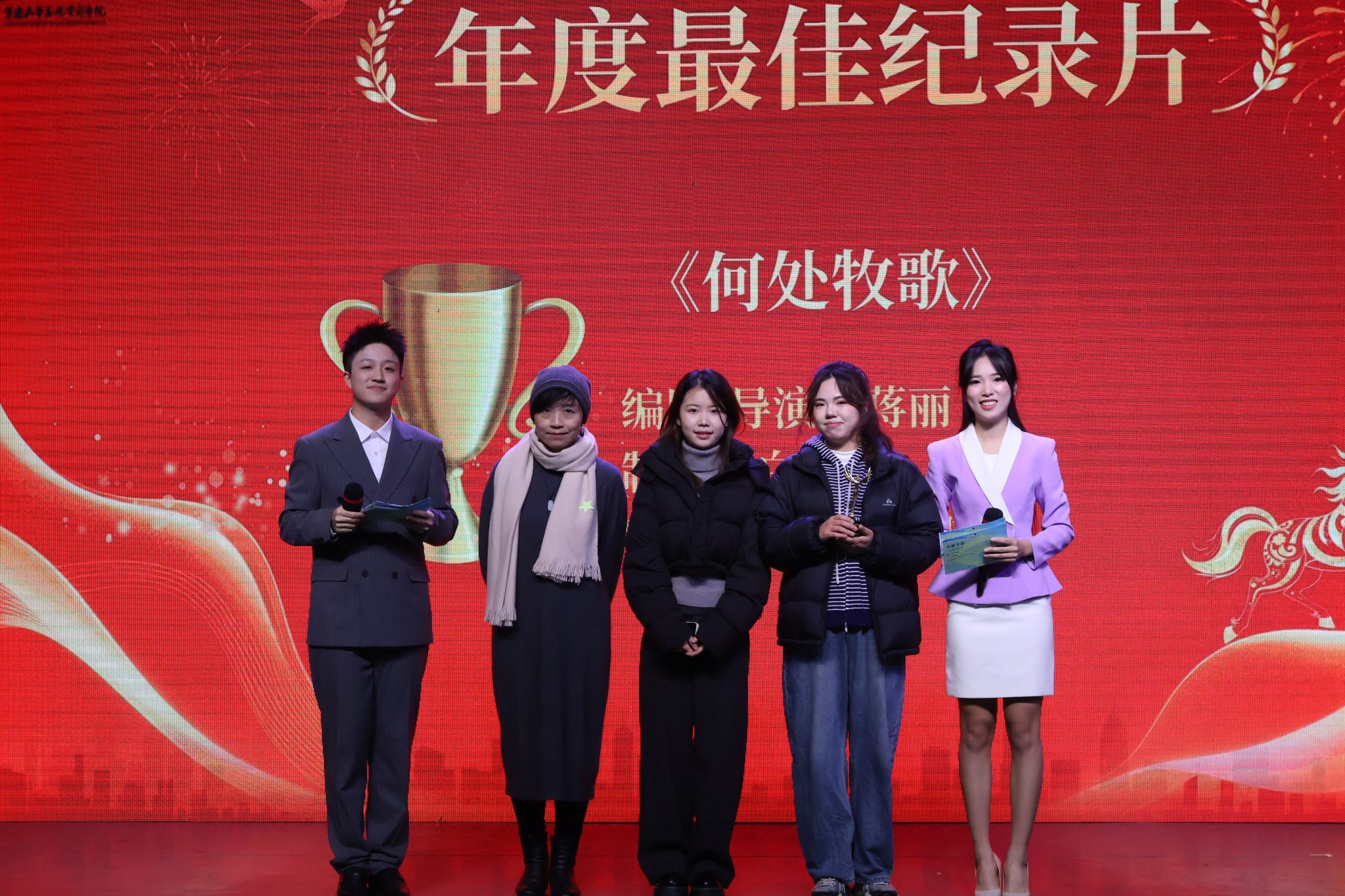 美视电影学院纪录片中心主任徐蓓教授为《何处牧歌》的主创团队——蒋丽和白晓茜颁发“年度最佳纪录片”奖并送上祝福。该片聚焦新农人返乡故事,记录 “走出去的渴望与留下来的眷恋”,以沉静有力的影像为“何以为家” 提供独特答案。