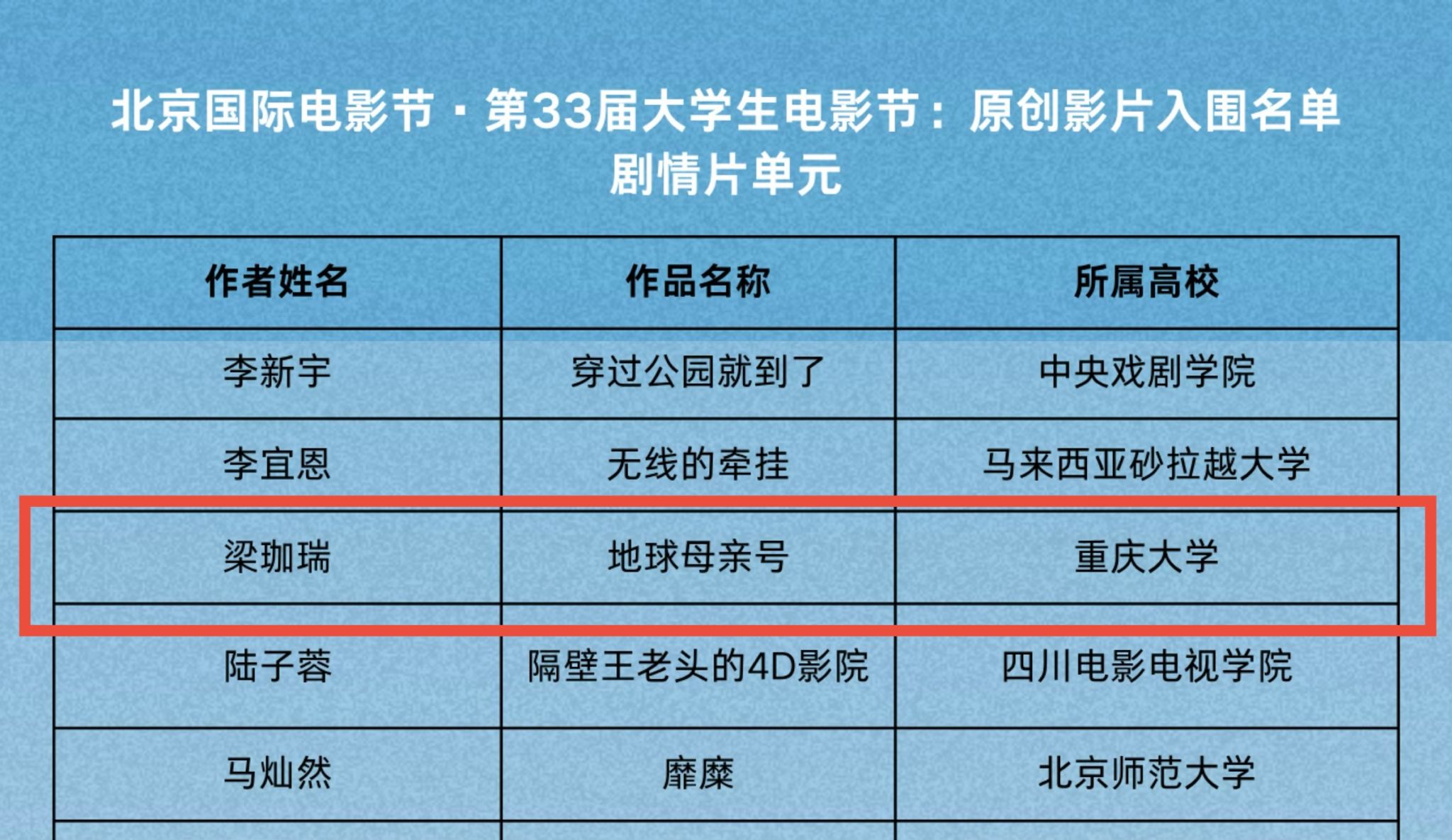 近日,北京国际电影节·第33届大学生电影节多项推选活动入选名单陆续揭晓,重庆大学美视电影学院学子不负韶华、奋勇争先,多部作品成功入围不同单元,在青春光影的舞台上展现美视风采与创作实力。