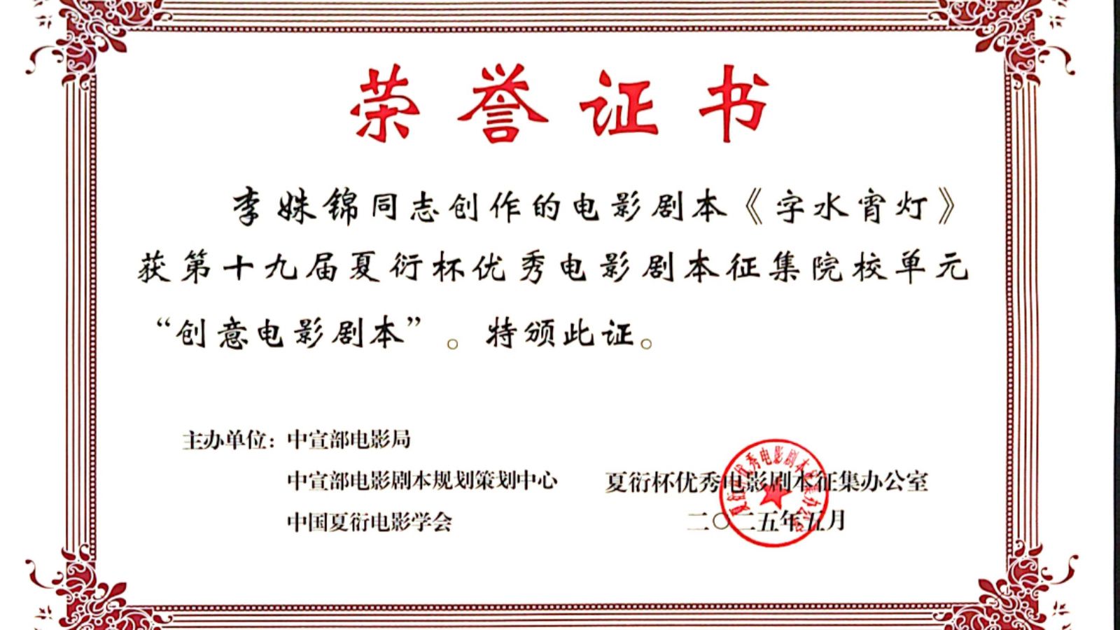 2025年5月21日下午,由中央宣传部电影局、中央宣传部电影剧本规划策划中心、中国夏衍电影学会共同举办的第十九届夏衍杯优秀电影剧本征集活动评选结果在浙江杭州大剧院(歌剧院)揭晓,美视电影学院2021级戏剧影视文学专业本科生李姝锦作品《字水霄灯》获评院校单元“创意电影剧本”奖。