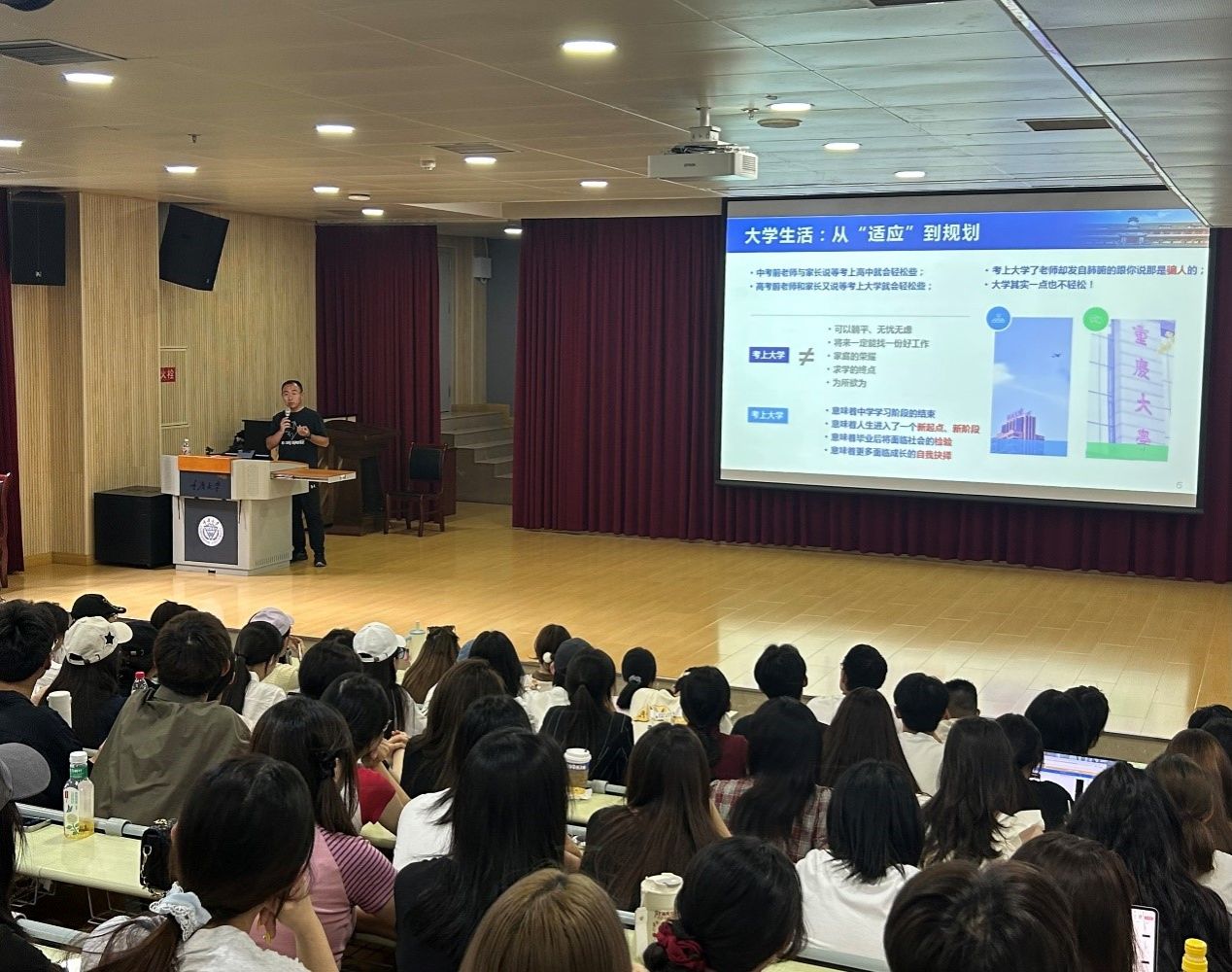 会上,厉宣浩首先进行了自我介绍,并围绕“大学生活适应与规划”“资源与支持”“规则与底线”“期待与约定”四大核心板块展开讲解。在“大学生活适应与规划”板块,厉宣浩纠正“大学可以躺平”的误区,并结合丰富详实的案例从学习、生活、安全三方面为同学们阐述了努力的方向和注意事项,重点提醒大家要防范电信网络诈骗,强化防骗意识。同时,他结合大学生将来的发展方向、当前就业形势等方面引导新生要尽快完成从“被动”到“主动”的角色转变,并给出各年级阶段的相关规划建议。在“资源与支持”板块,他向同学们介绍了校内心理支持、资助政策、学生组织等政策资源,希望同学们用好校内外资源,努力提升自身综合素养。在“期待与约定”板块,厉宣浩结合当前我国所处在百年未有之大变局的形势,寄语同学们要筑牢理想信念根基,培养家国情怀,深耕专业领域,积极培养创新能力,主动投身社会实践与志愿服务活动,努力成长为堪当民族复兴大任的时代新人。在“规则与底线”板块,他结合典型案例向同学们强调了遵纪守法的重要性,叮嘱大家守牢底线和红线,严格遵守国家法律法规、校规校纪,培养诚信考试与文明上网意识。