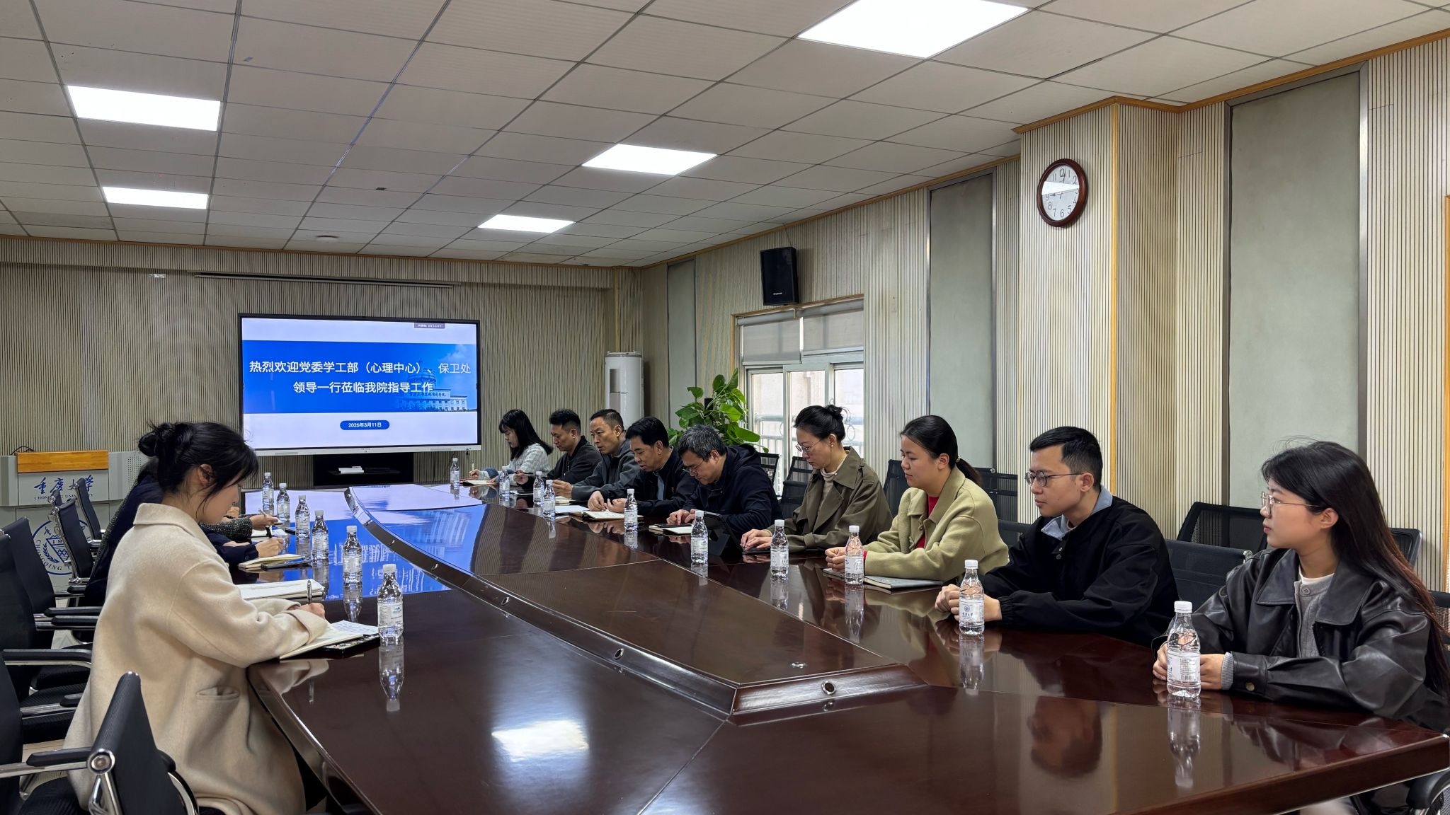 3月11日上午,重庆大学党委学生工作部(心理健康教育与咨询中心)、保卫处一行来院开展调研交流,围绕学生工作、校园安全、心理育人等重点工作深入对接、共商对策。党委学工部副部长何建华、心理健康教育与咨询中心主任吕敏、保卫处副处长贺兵,学院党委副书记、纪委书记赵华等及学院全体辅导员参加调研交流会议。