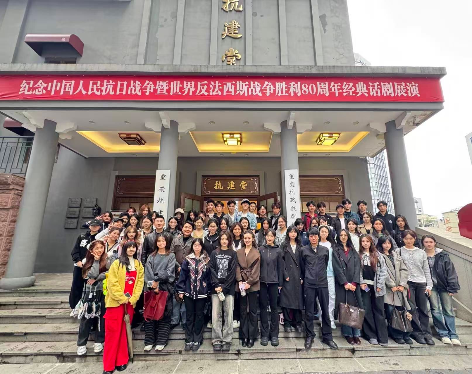 11月6日下午3时,在张高杨、田雨、赵虎三位班主任老师的带领下,美视电影学院25级表演系学生们走进抗建堂戏剧博物馆,在剧场实景与历史展厅中深度感受戏剧艺术的魅力与红色文化的力量。抗建堂作为重庆抗战文化的重要地标,承载着中国话剧黄金岁月的辉煌记忆。在抗建堂剧场内,讲解员介绍了舞台布局、灯光音效系统等专业设施。随后,学生们在讲解员的引导下走上舞台,近距离观察舞台,感受百年剧场的厚重底蕴。走进剧场后台,换...